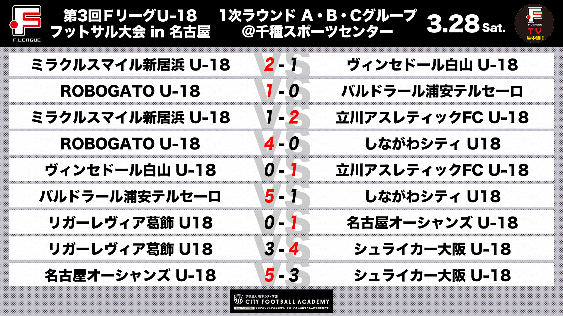 | 【9】Cグループ | 18:00 | 名古屋オーシャンズ U-18 5-3 シュライカー大阪 U-18 |