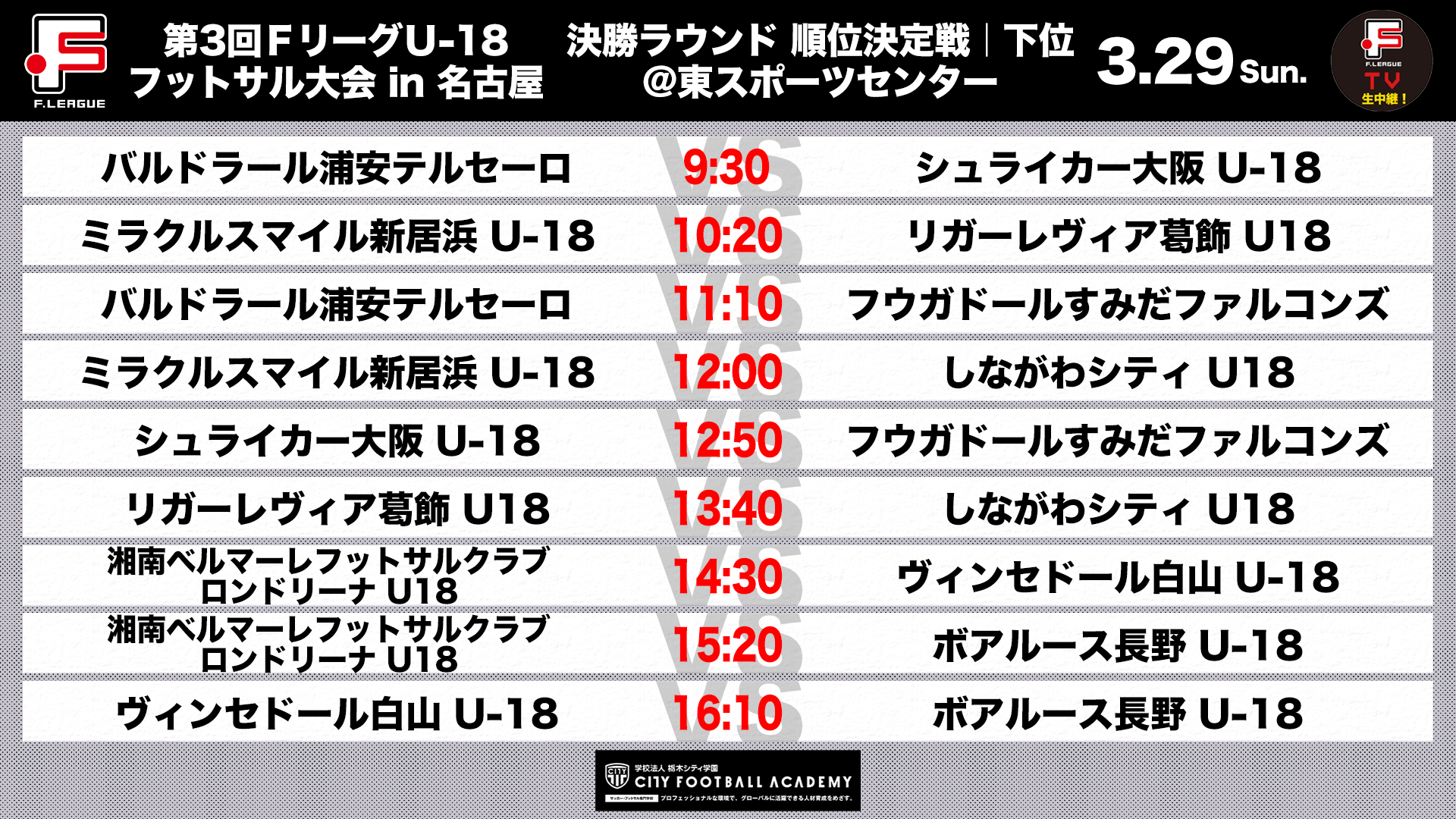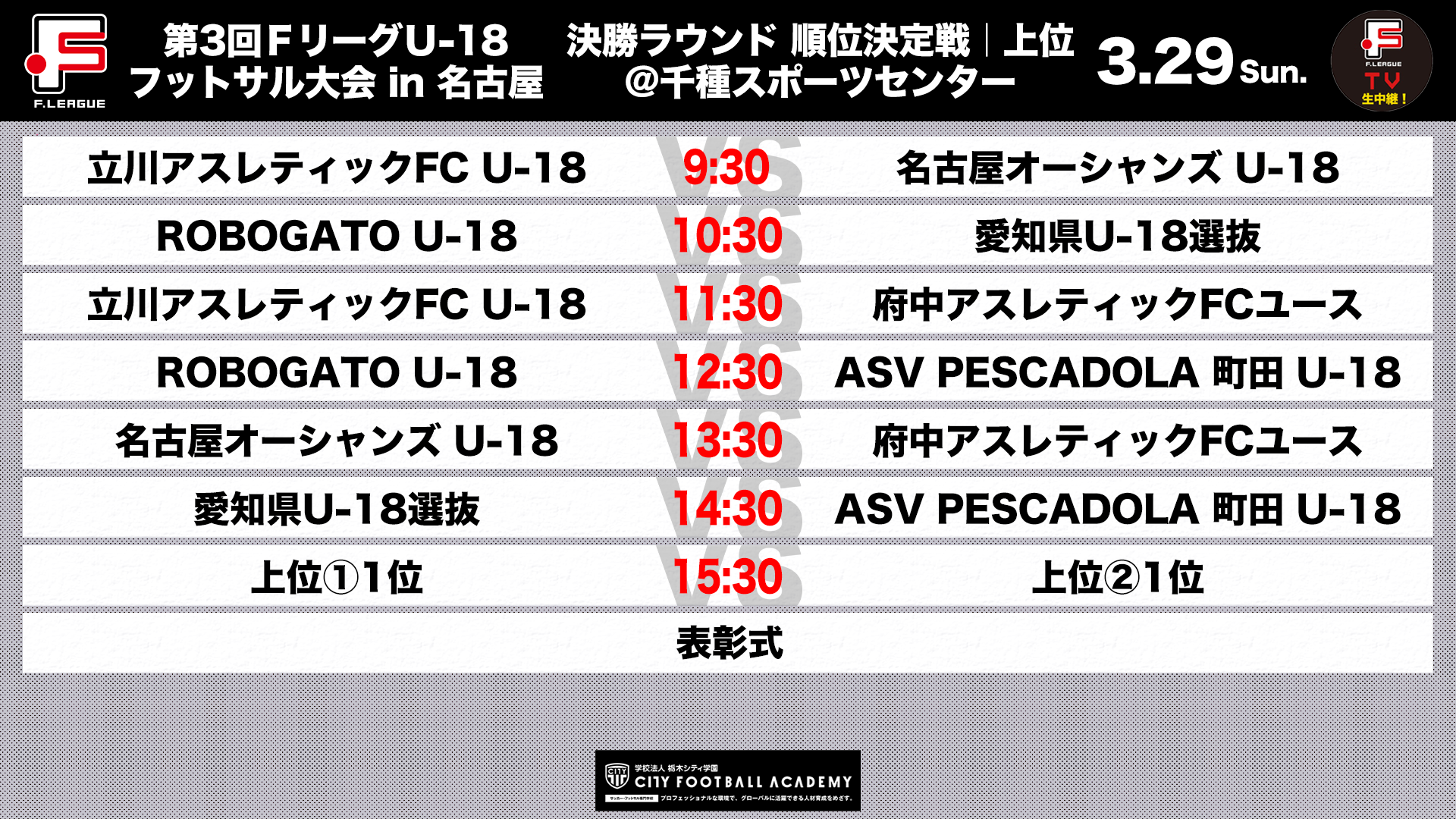 3月28日(土)、29日(日)の2日間、千種スポーツセンター及び東スポーツセンターで実施している「第3回FリーグU-18フットサル大会 in 名古屋」において、優勝決定戦/順位決定戦の対戦カードが決定しましたのでお知らせいたします。